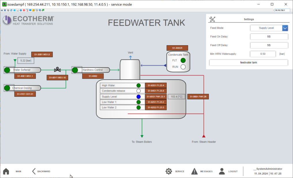 - Wasserzufuhr: Wasser wird in das System gepumpt, welches vorher aufbereit wird (Chemische Dosierung, Enthärtung).